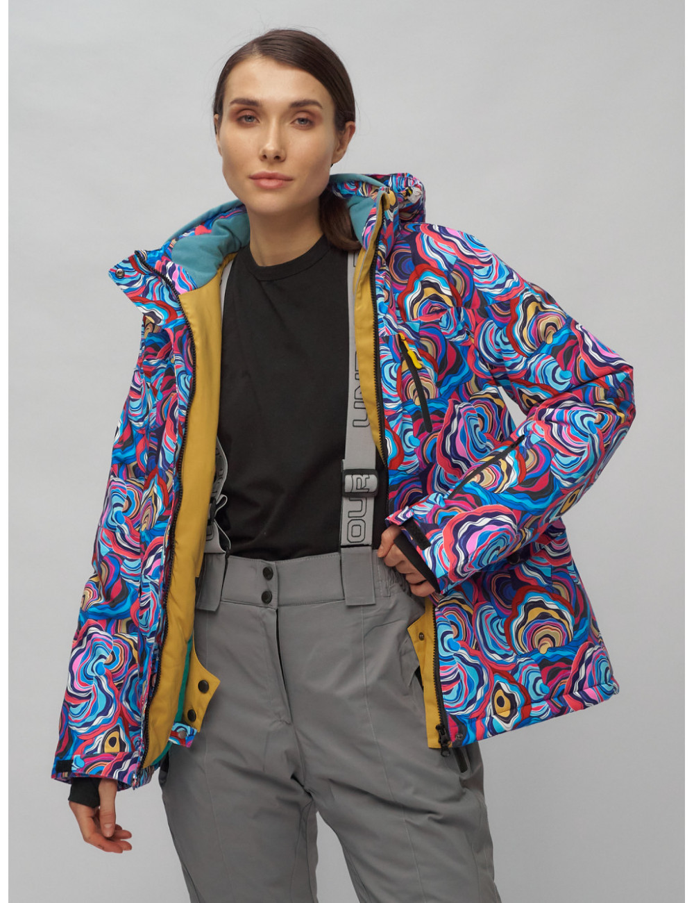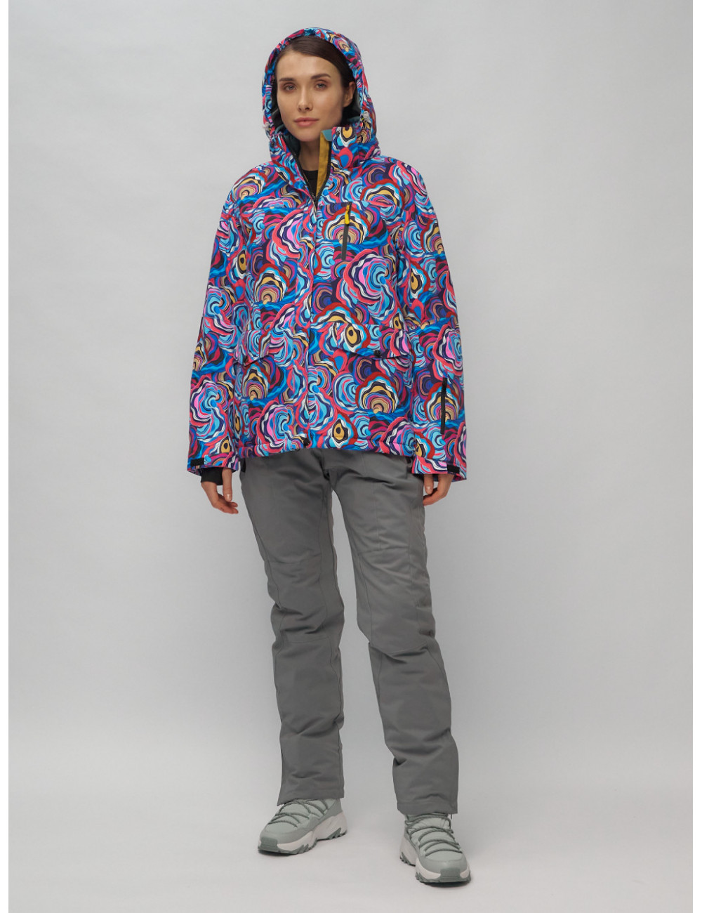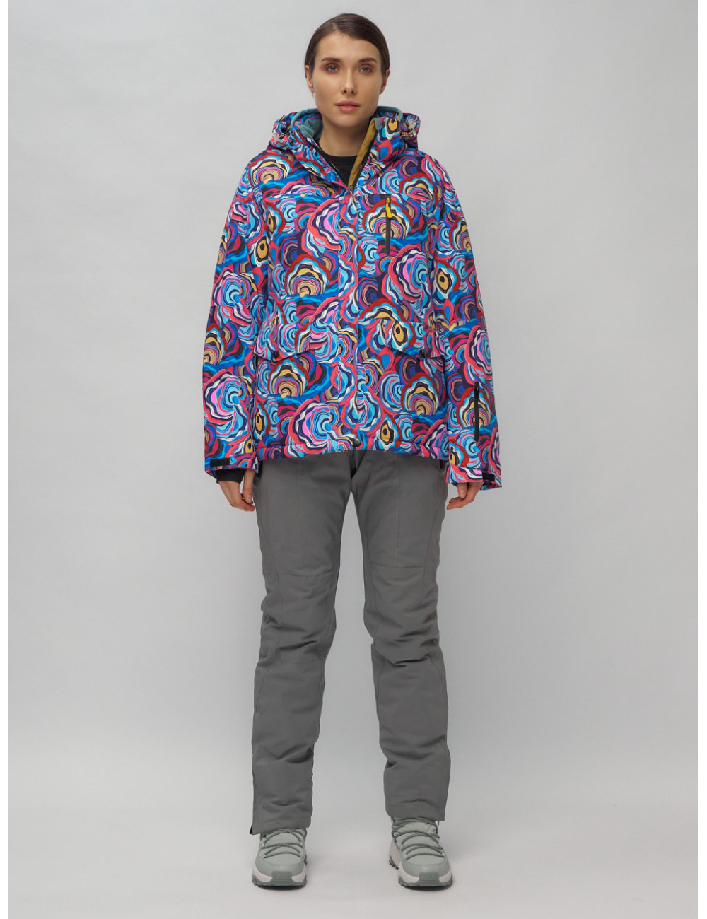 Комплект состоит из горнолыжных брюк с бретелями и привлекательной, полуприталенной куртки с цветочным принтом.