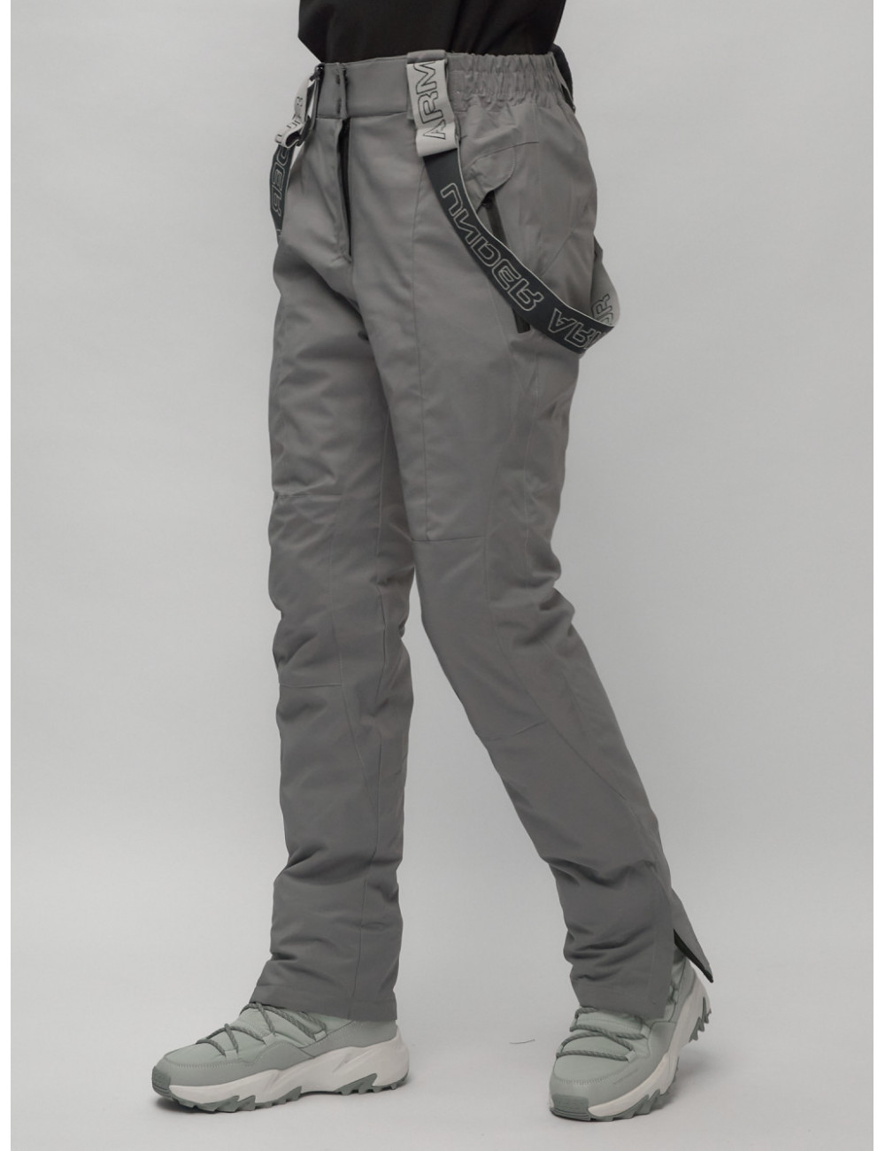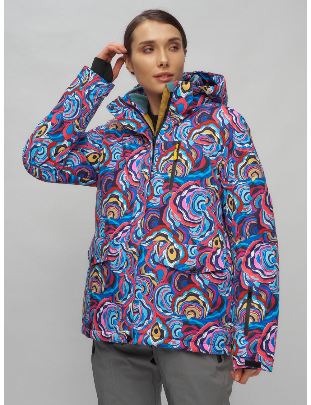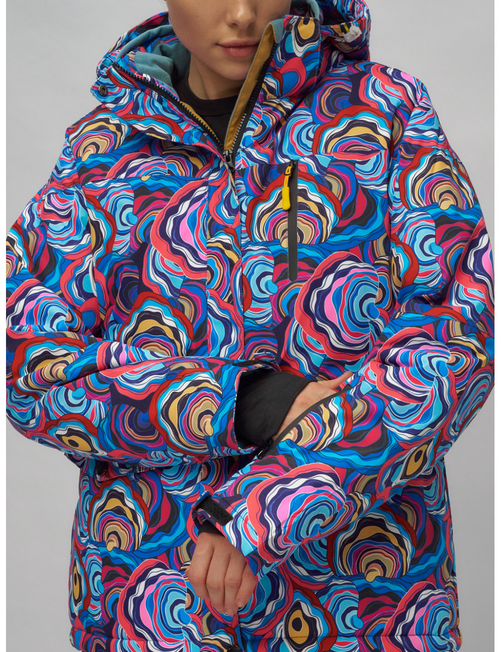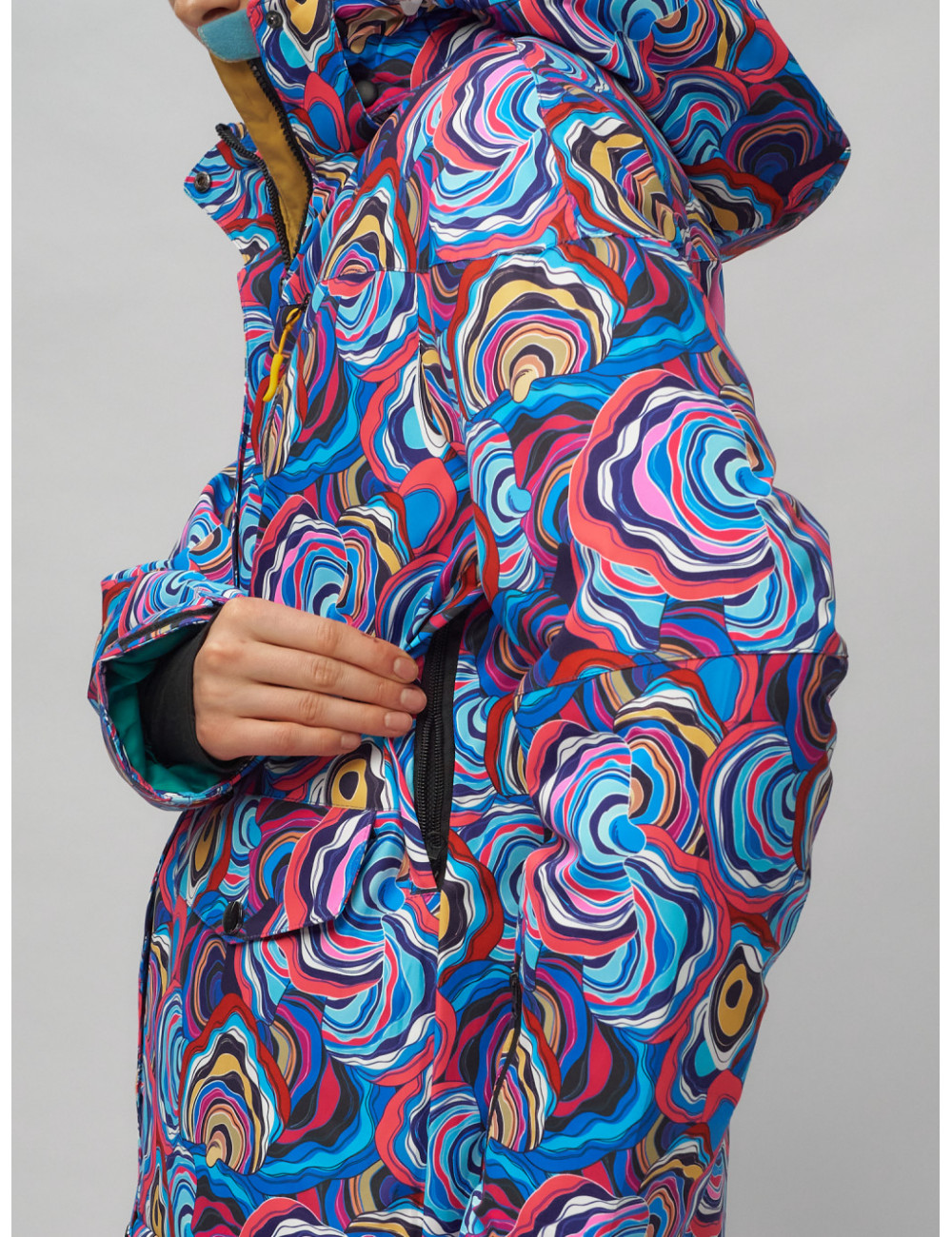 Комплект состоит из горнолыжных брюк с бретелями и привлекательной, полуприталенной куртки с цветочным принтом.