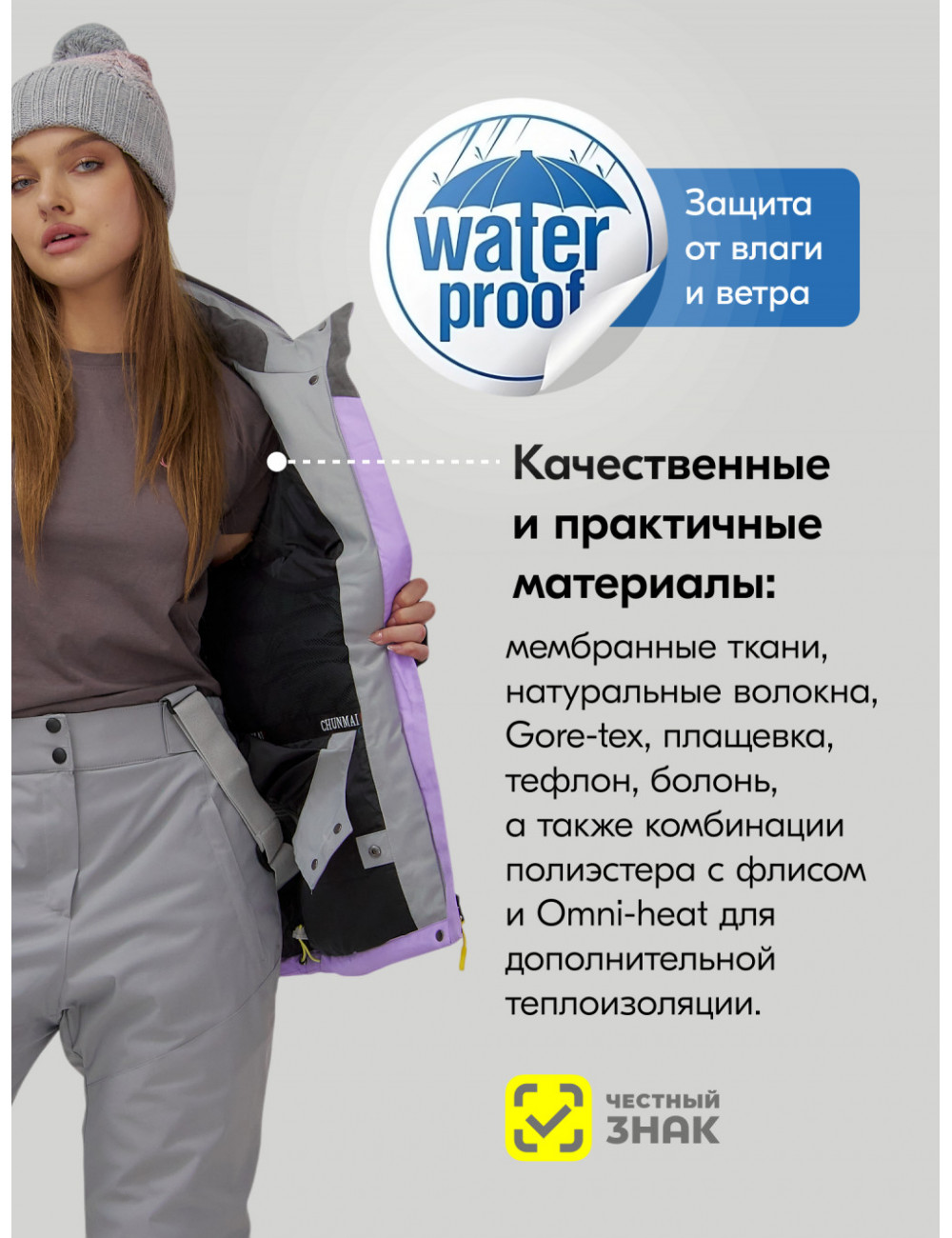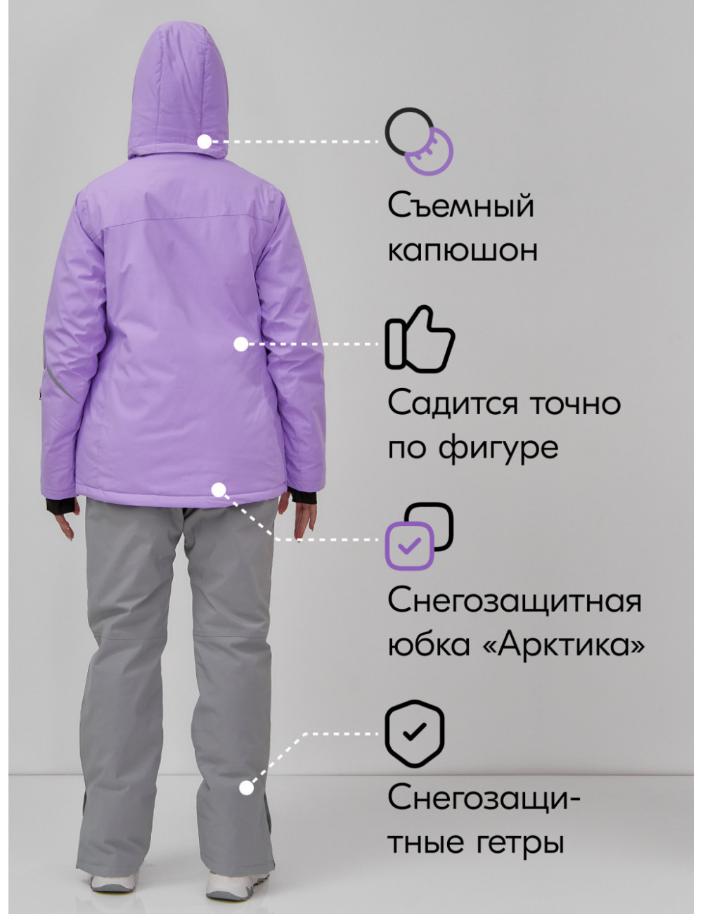 Наш горнолыжный костюм станет отличным выбором для зимних прогулок, катания на лыжах и сноуборде. Он прекрасно сочетается с термобельём, тёплыми шапками и перчатками. Вы сможете сосредоточиться на удовольствии от катания, не отвлекаясь на неудобства. Доставка по Москве и Московской области Женский горнолыжный костюм сиреневого цвета