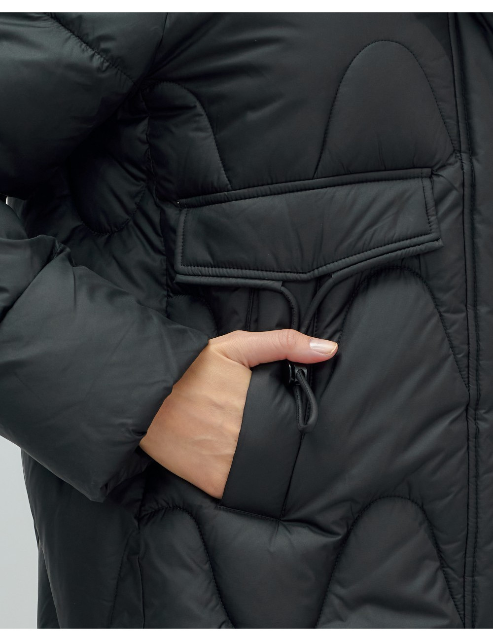- Фиксаторы на капюшоне, по низу пуховика и около карманов для регулировки посадки и сохранения тепла.