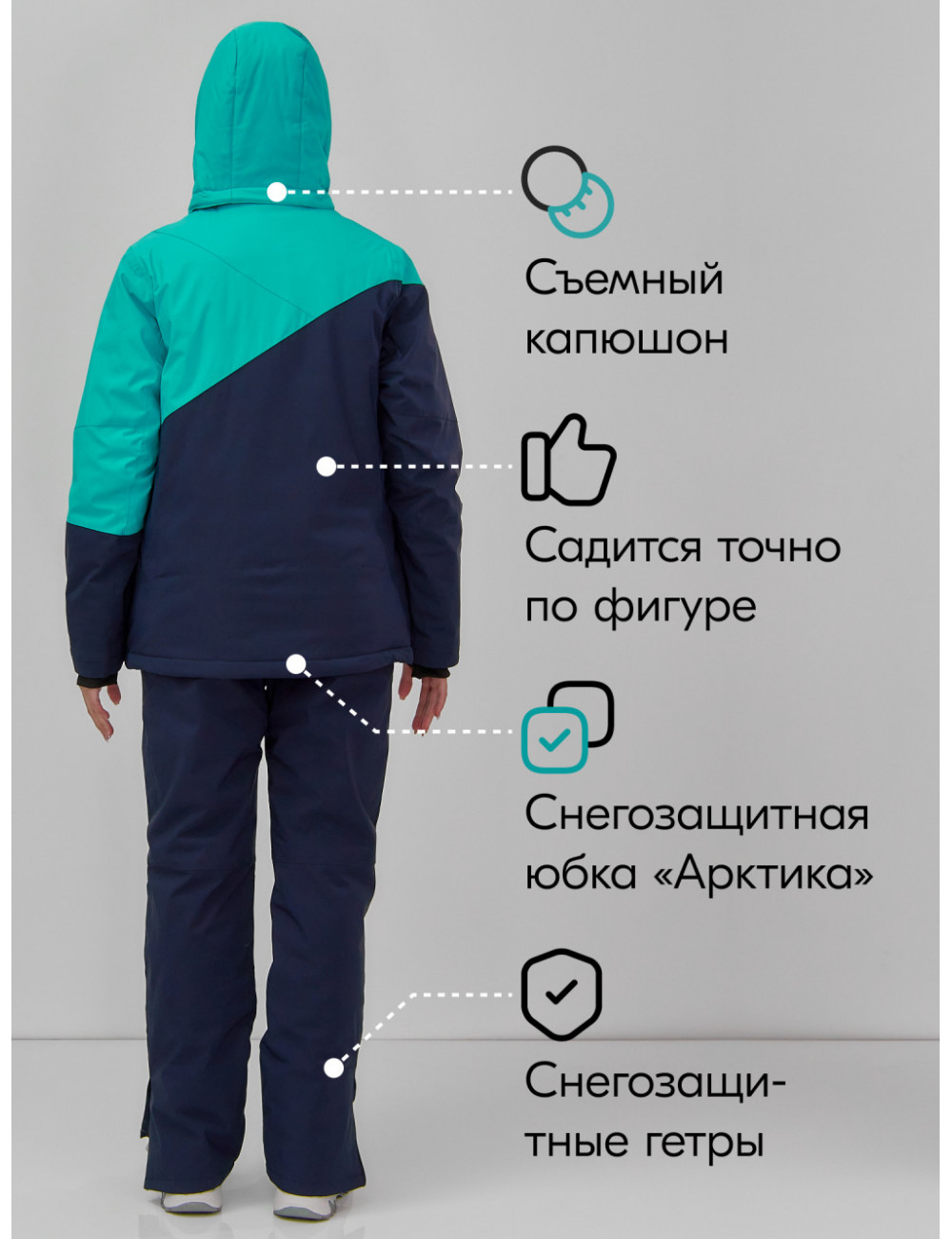 Сочетание стиля и функциональности делает этот горнолыжный костюм идеальным выбором для зимних видов спорта. Наслаждайтесь каждым моментом на склоне, оставаясь уверенными и стильными! Доставка по Москве и Московской области Женский горнолыжный костюм бирюзового цвета