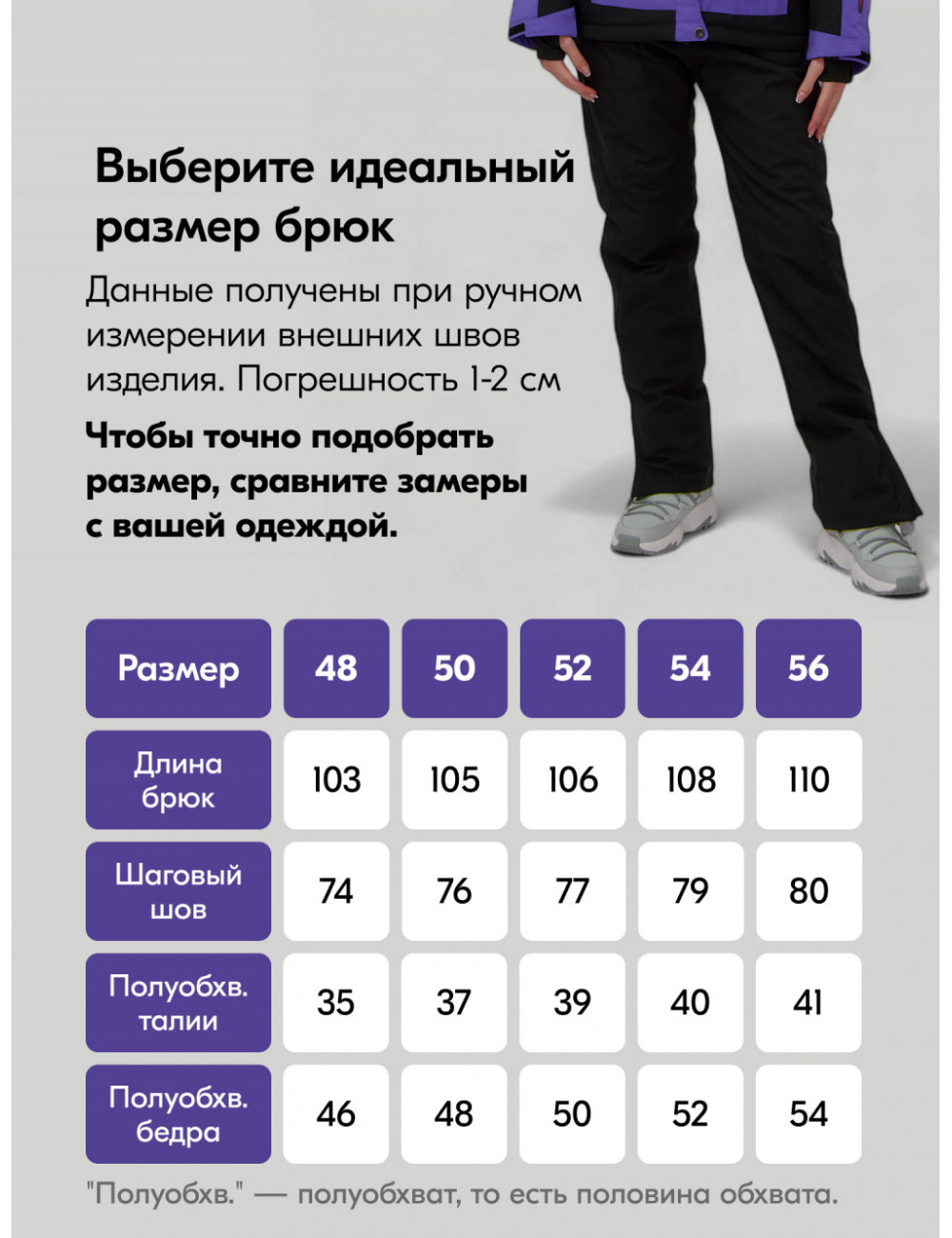 При выборе размера горнолыжного костюма важно учитывать индивидуальные параметры. Рекомендуем измерить длину куртки, длину рукава, полуобхват рукава, полуобхват груди, полуобхват бёдер и длину плеч по спине. Используйте сантиметровую ленту для точности измерений.