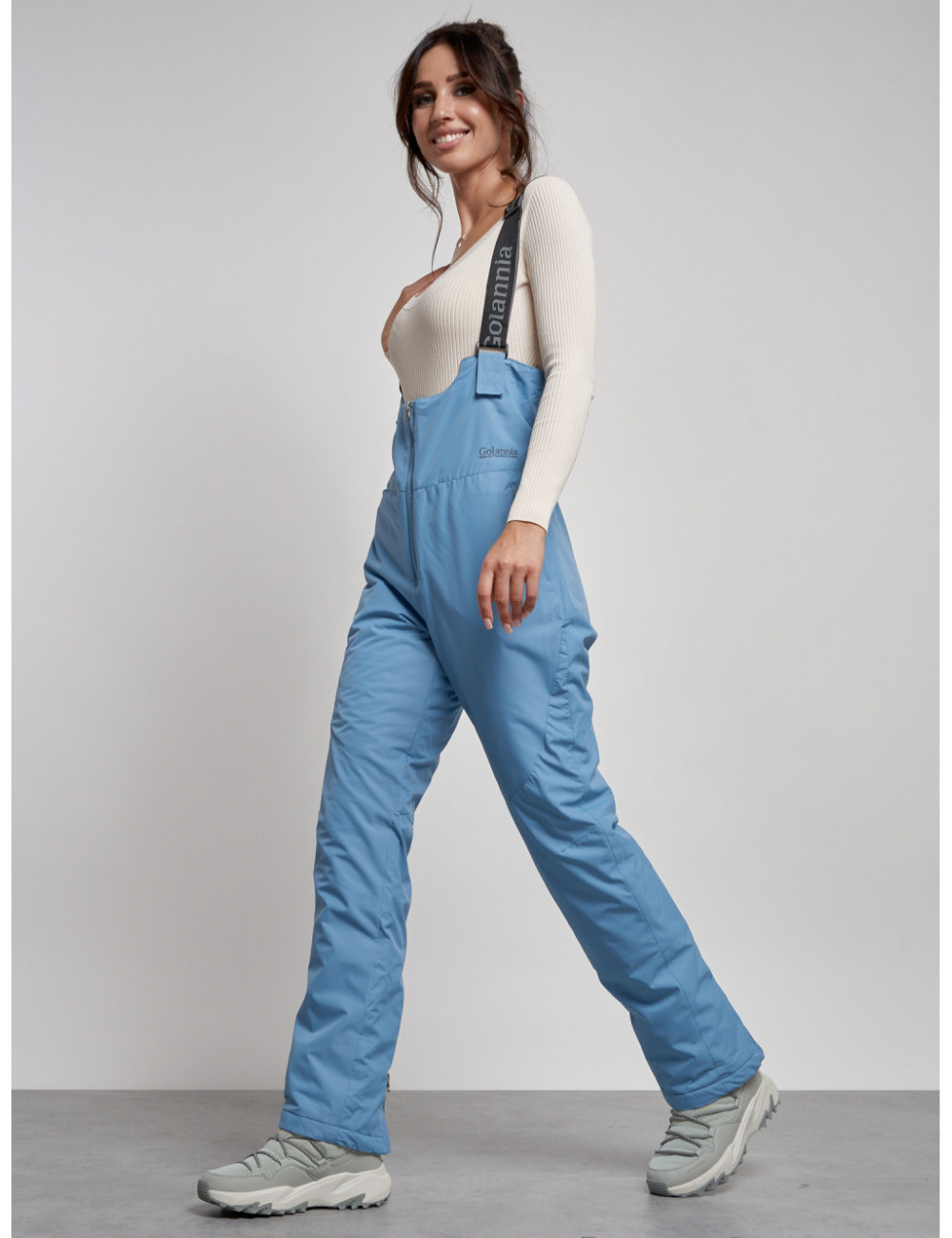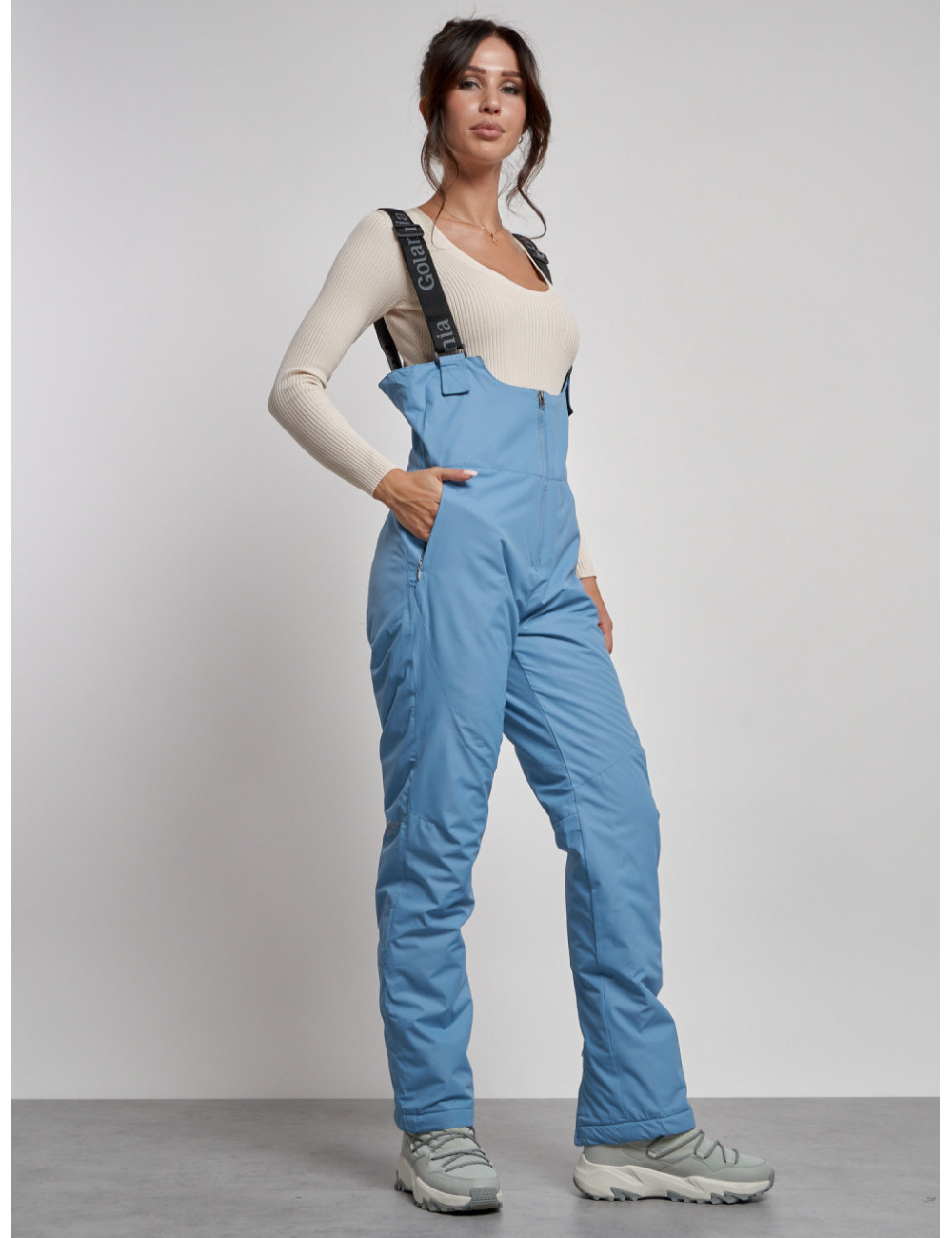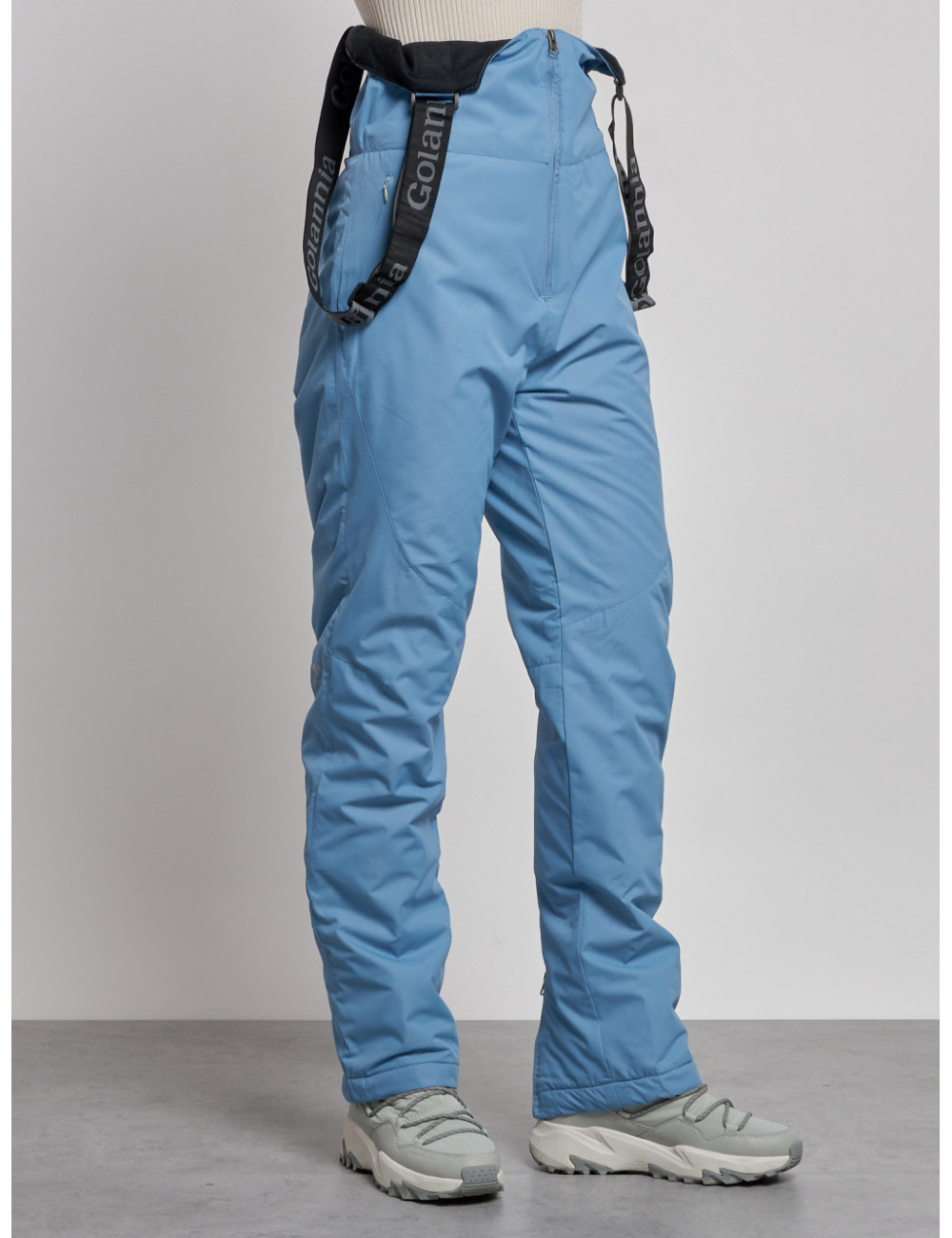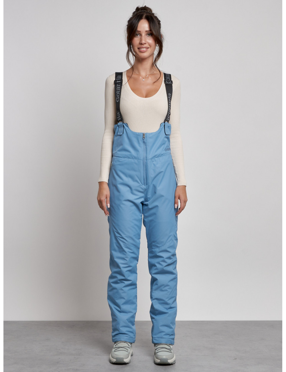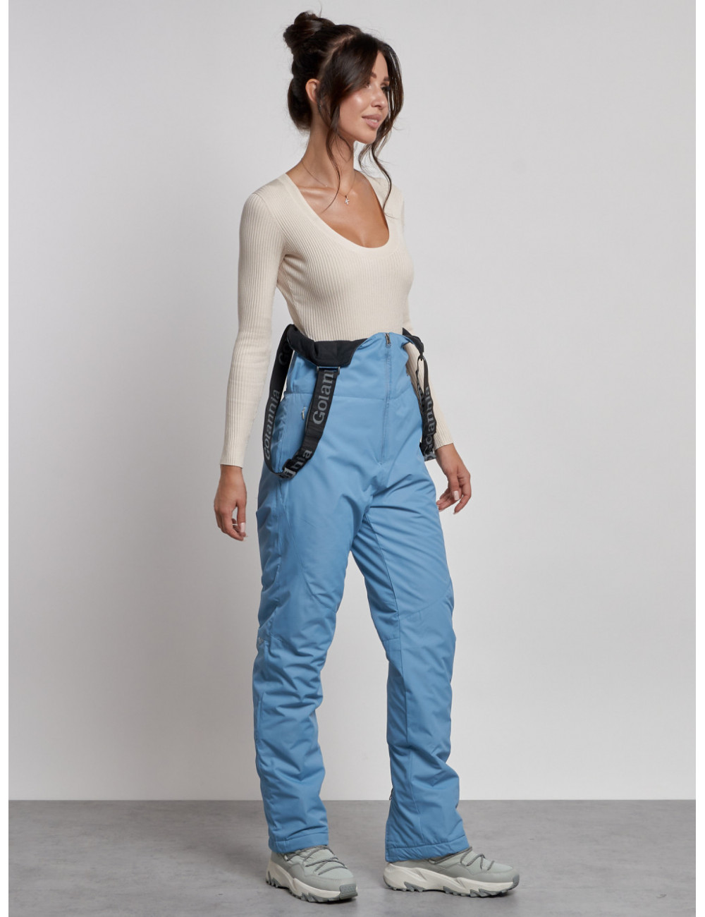 С нашим полукомбинезоном вы сможете наслаждаться зимними видами спорта и активным отдыхом, не отвлекаясь на холод и дискомфорт. Доставка по Москве и Московской области Женский зимний полукомбинезон с высокой посадкой, голубой, брюки для холодного времени года.