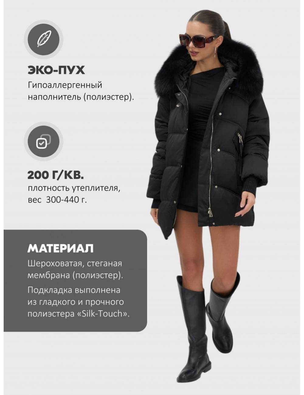 Особенности модели | быстросохнущая, ветрозащита, водоотталкивающий материал, гипоаллергенный материал, дышащий материал, съемная опушка |