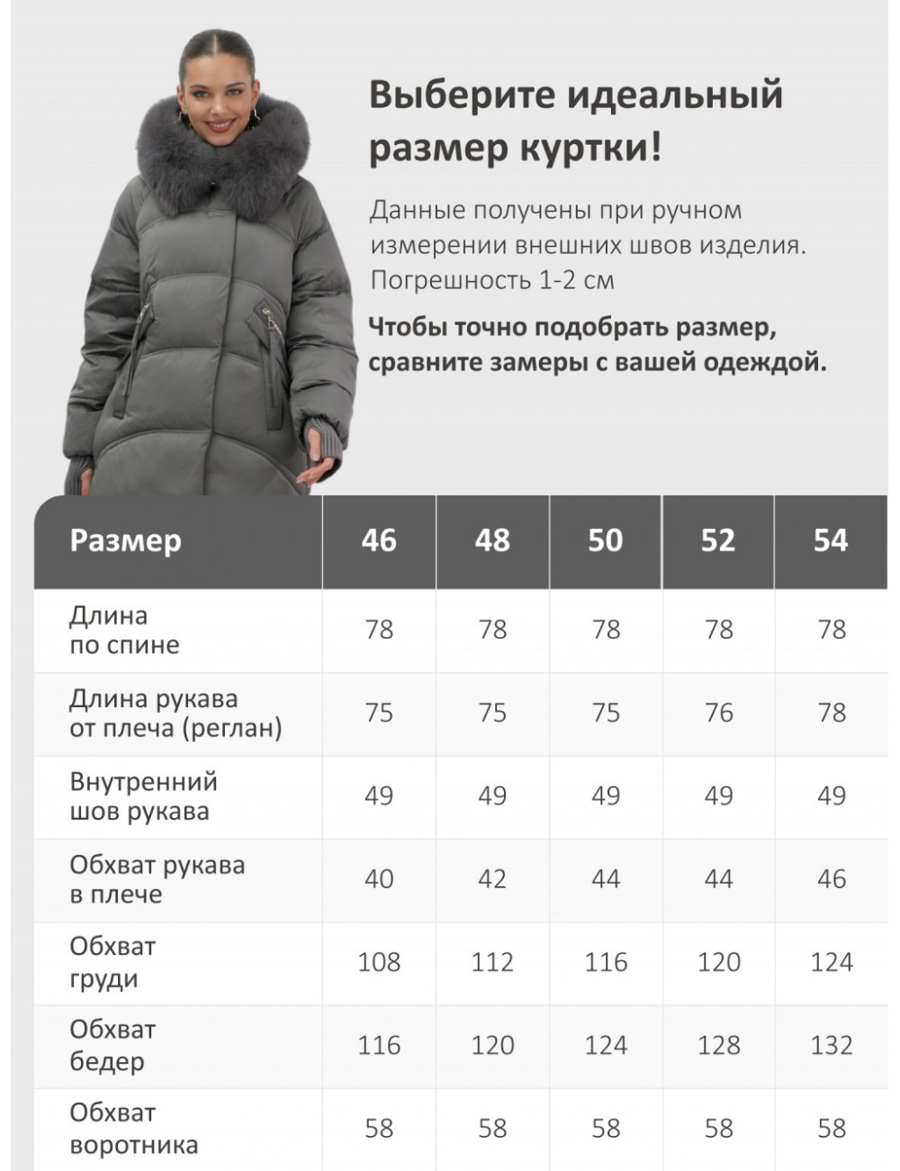 - Удлинённый силуэт до колена и свободный крой создают идеальные пропорции для размеров 46–54.