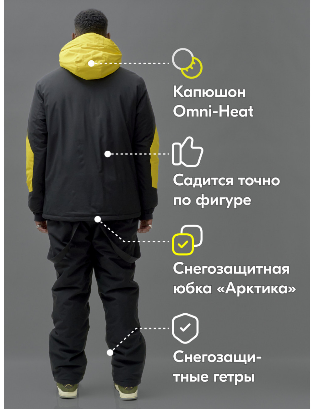 Наш горнолыжный костюм оснащён всеми необходимыми элементами для защиты от холода и непогоды: