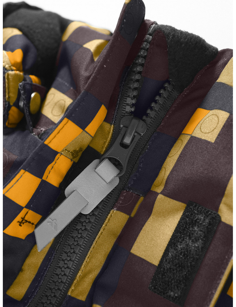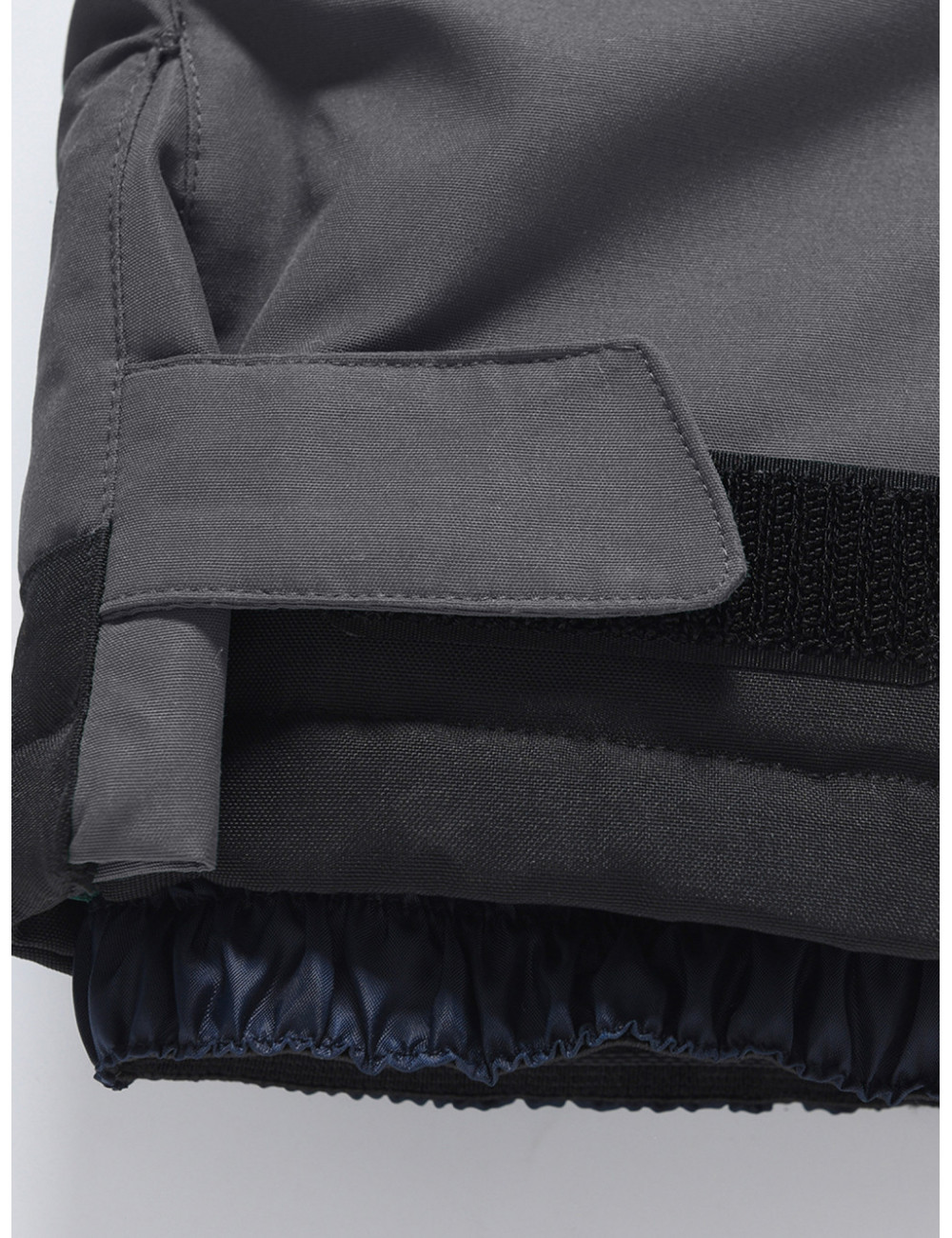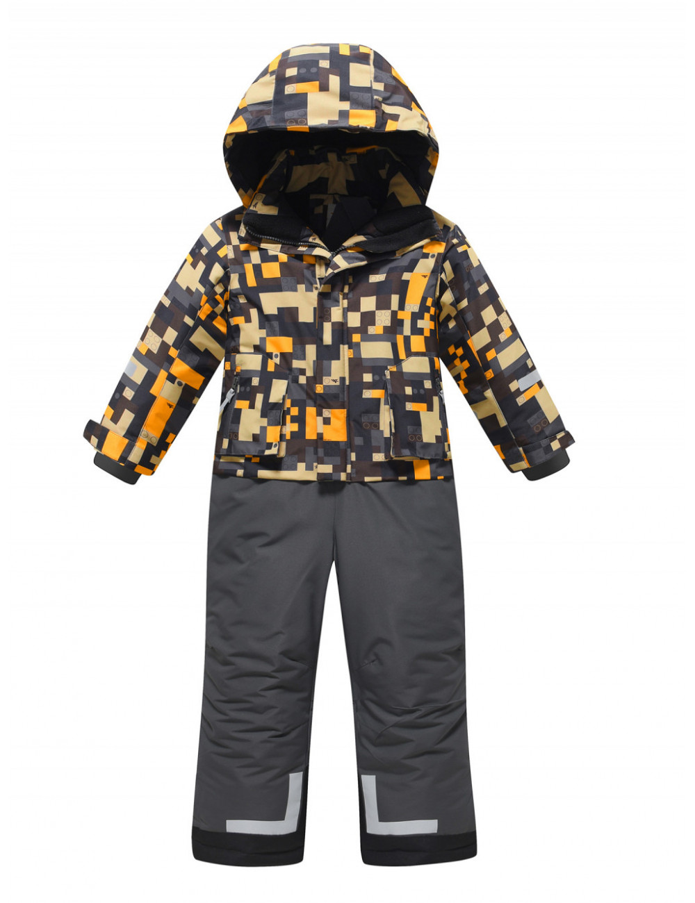 Комбинезон оснащён светоотражающими элементами, эластичными перчатками-манжетами, внутренними лямками, снегозащитными гамашами, съёмным капюшоном и накладными карманами на молнии.
