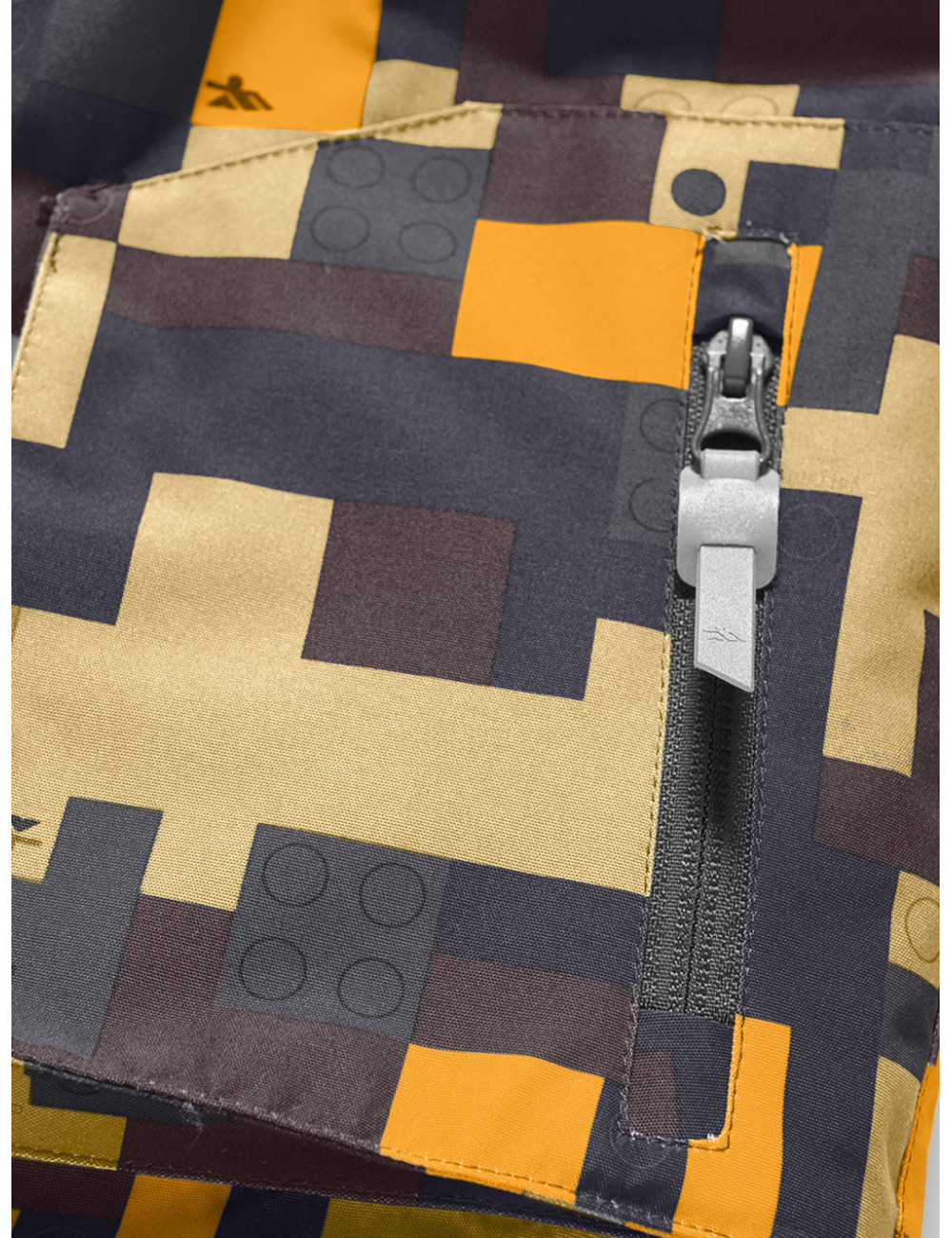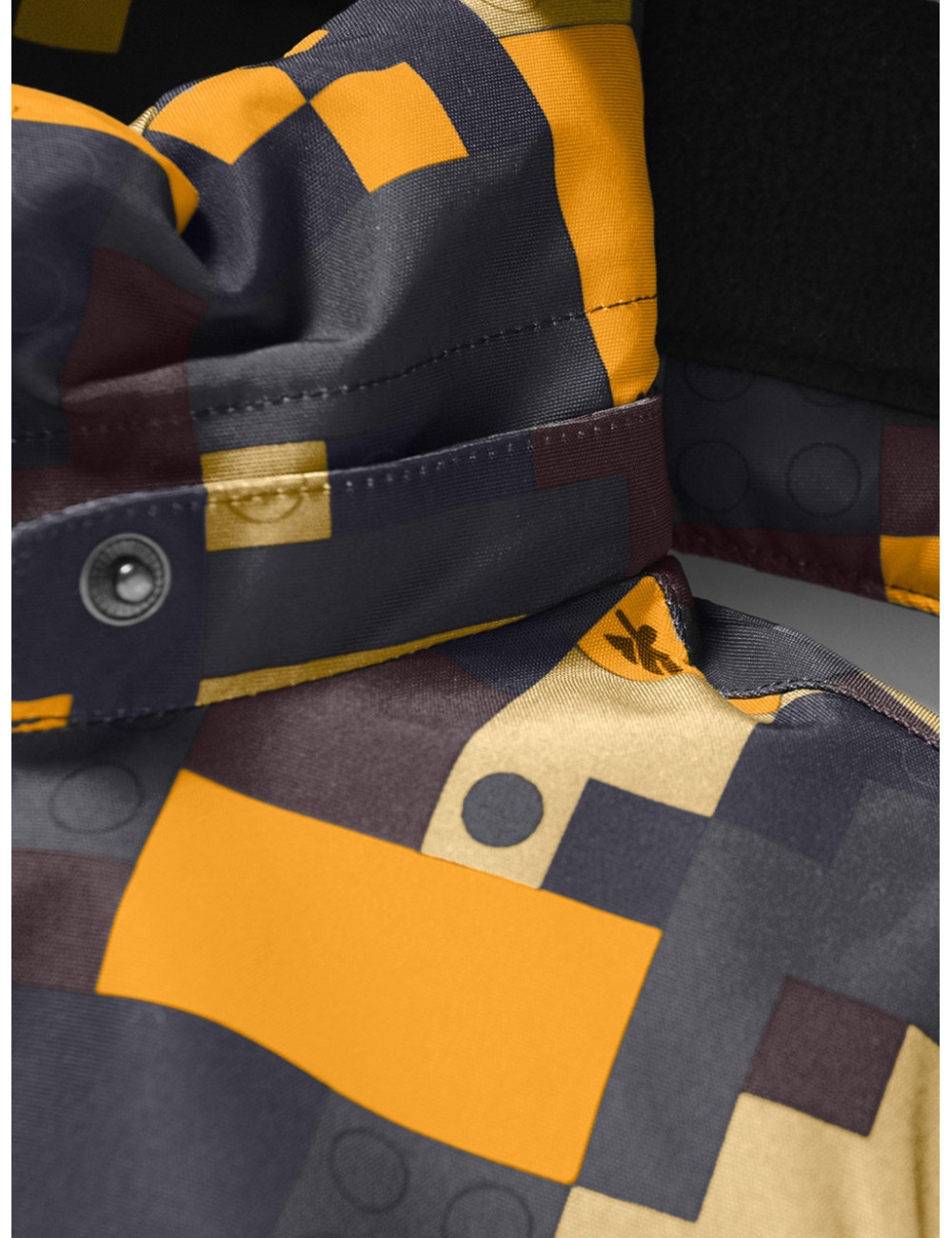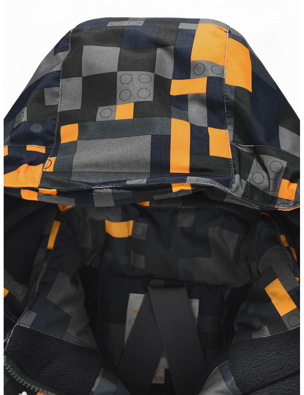 Комбинезон оснащён светоотражающими элементами, эластичными перчатками-манжетами, внутренними лямками, снегозащитными гамашами, съёмным капюшоном и накладными карманами на молнии.