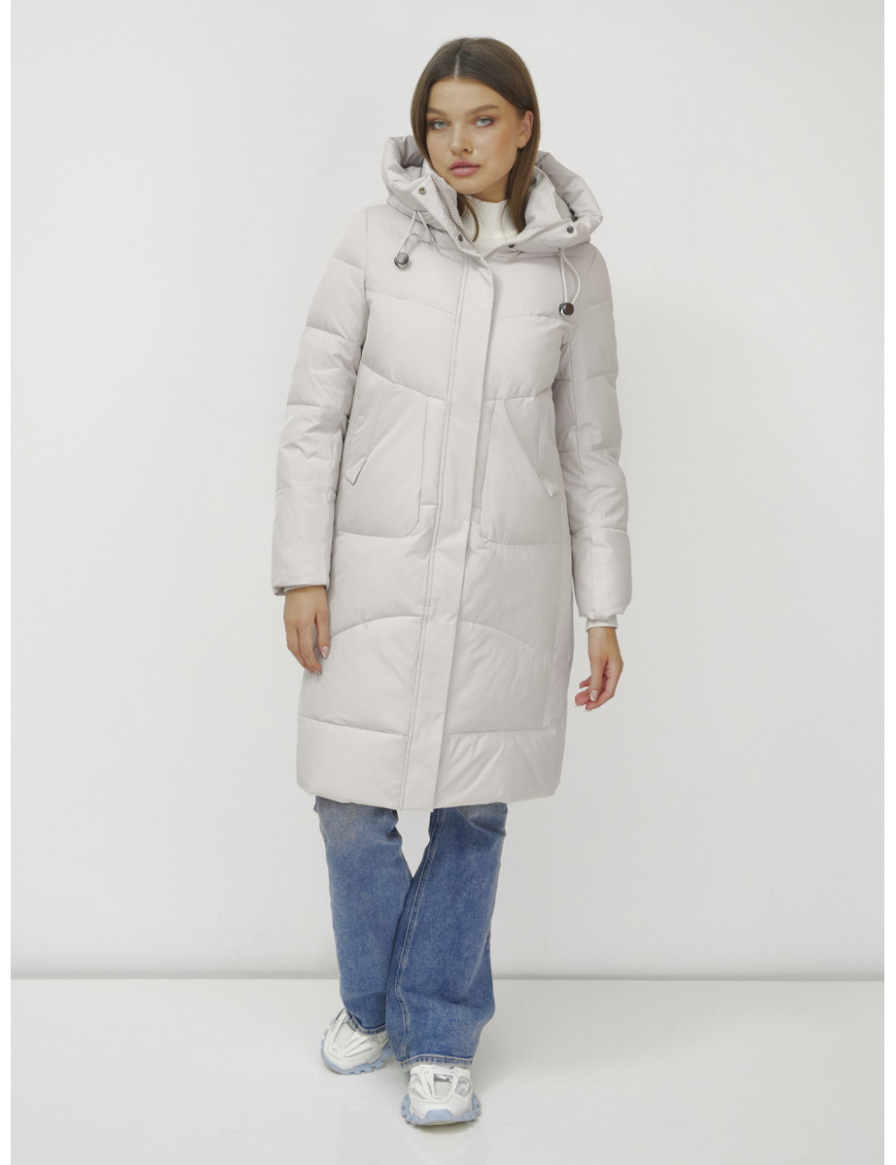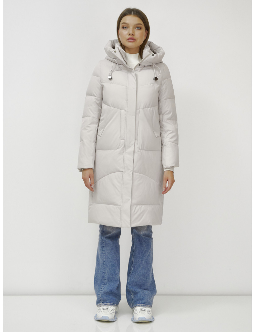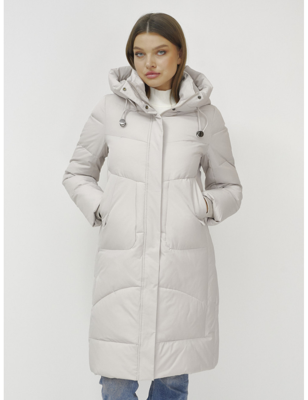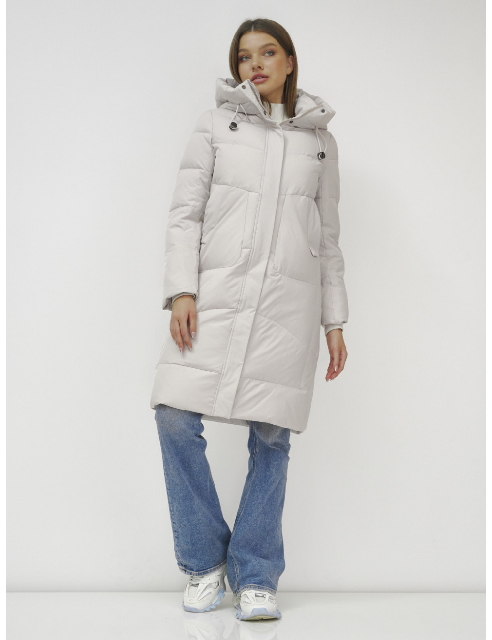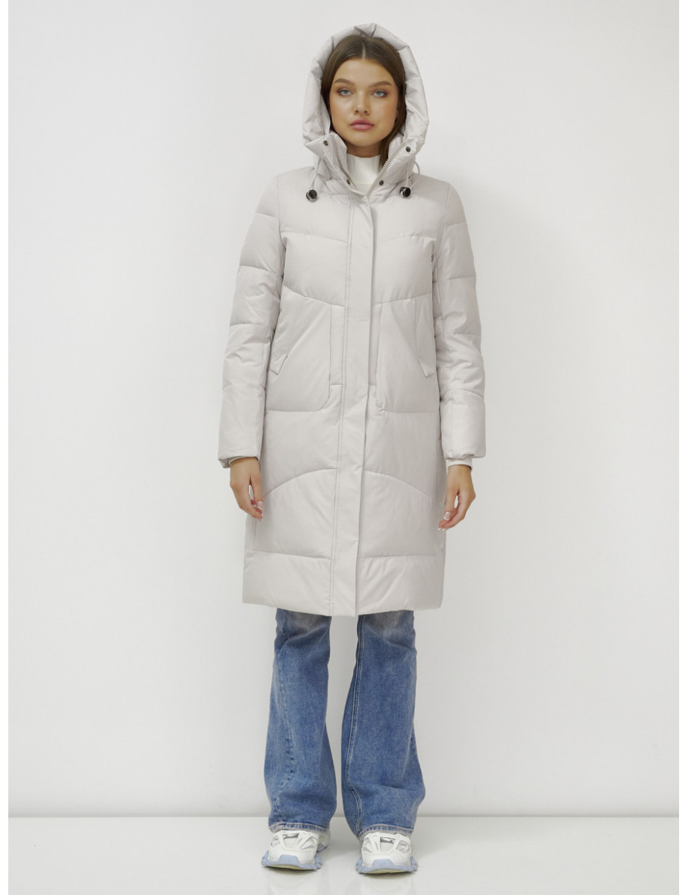 В пуховике есть воротник-стойка, несъёмный капюшон с фиксаторами, ветрозащитная планка на кнопках, двойной замок, прорезные боковые карманы на кнопках, утеплённые флисом, внутренний карман и трикотажные манжеты. Доставка по Москве и Московской области Женский зимний пуховик с капюшоном, удлинённый, бежевый.