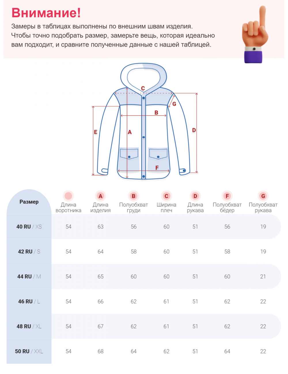 При выборе размера ориентируйтесь на индивидуальные параметры. Куртка легко адаптируется под ваш стиль и погодные условия благодаря съёмной опушке и регулируемому ремешку.