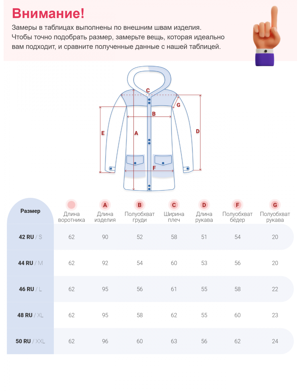 Наша куртка представлена в различных размерах, чтобы каждый мог найти свой идеальный вариант. Обратите внимание на описание размеров и следуйте рекомендациям по выбору размера.