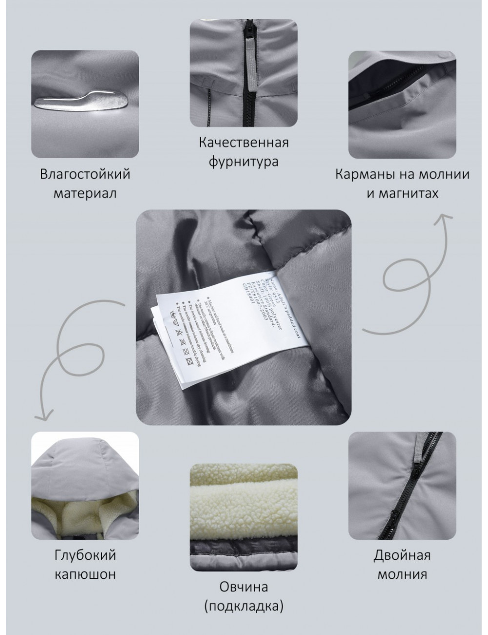 | Фиксаторы | На рукавах, по середине, на капюшоне |