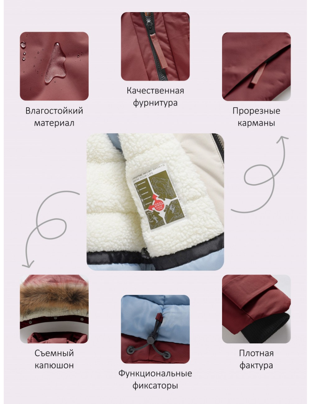 - Фиксаторы на рукавах, по линии талии, на капюшоне и по низу парки. Помогают сохранить тепло и защитить ребёнка от продувания.