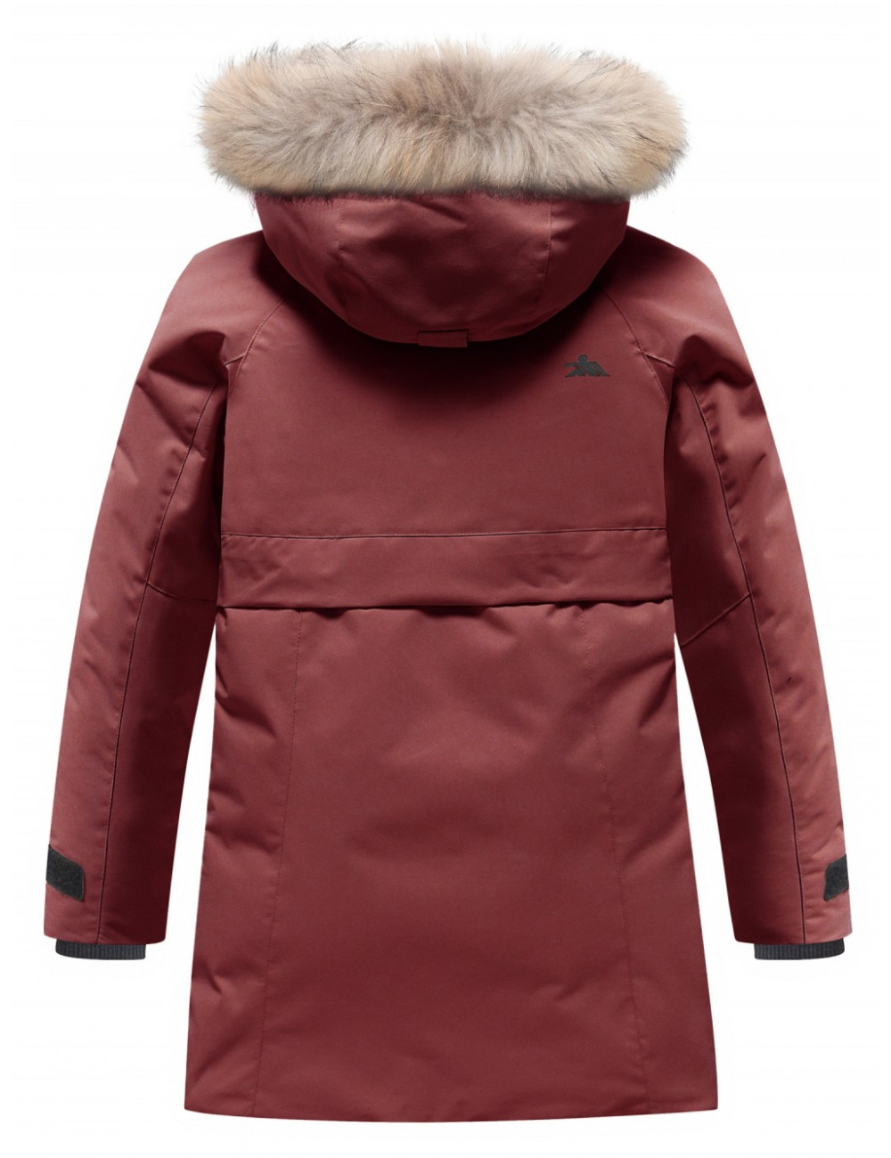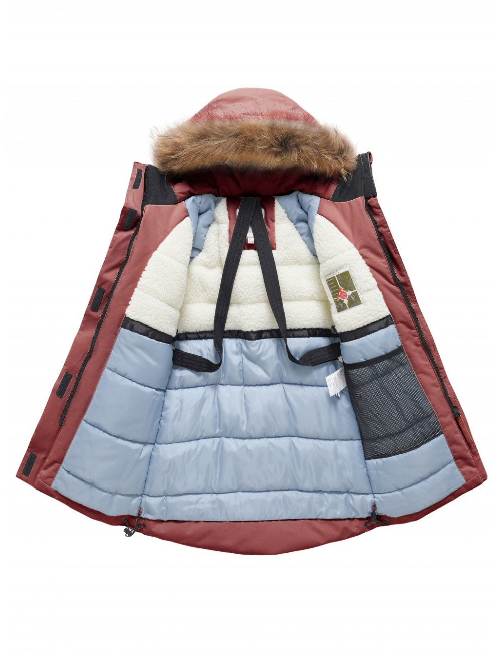 - Защищённость от непогоды. Капюшон с меховой отделкой защищает от ветра и снега, а фиксаторы на рукавах, по линии талии, на капюшоне и по низу парки помогают сохранить тепло.