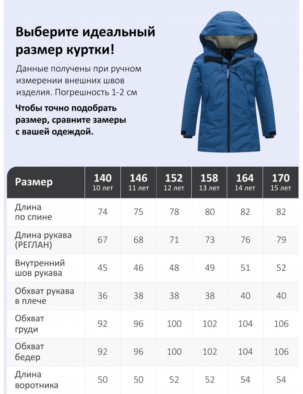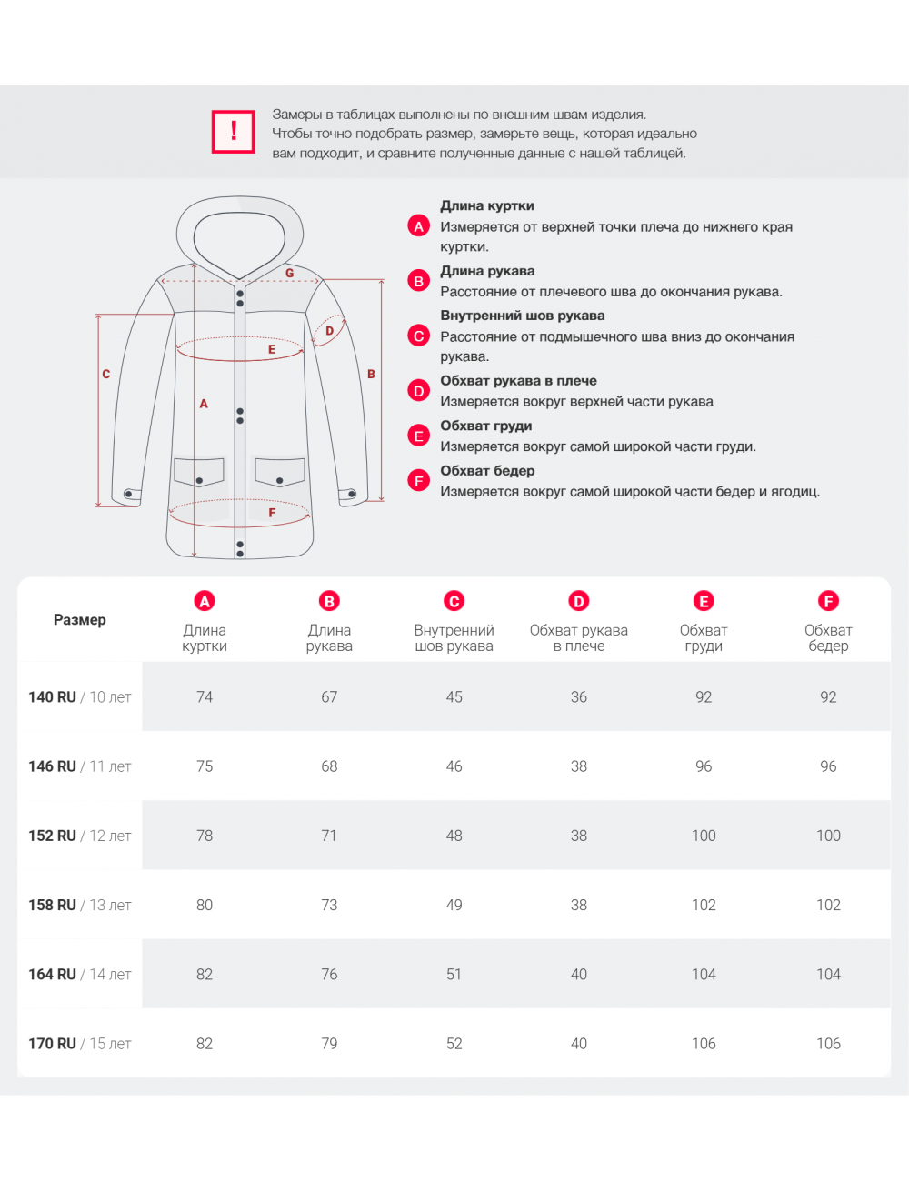 Ответ: при выборе размера важно учитывать индивидуальные параметры ребёнка. Рекомендуем измерить длину куртки, длину рукава, внутренний шов рукава, обхват рукава в плече, обхват груди и обхват бёдер. Эти параметры помогут подобрать идеальный размер.