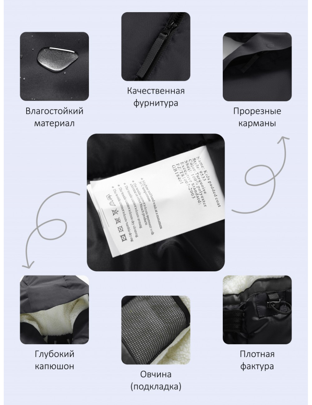 | Фиксаторы | На рукавах, по середине, на капюшоне |