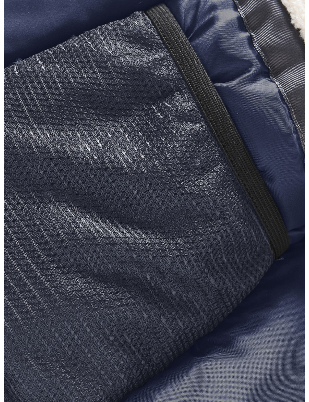 - Высокий воротник-стойка надёжно защищает от проникновения холода, а защита подбородка предотвращает раздражение кожи при закрытии молнии.