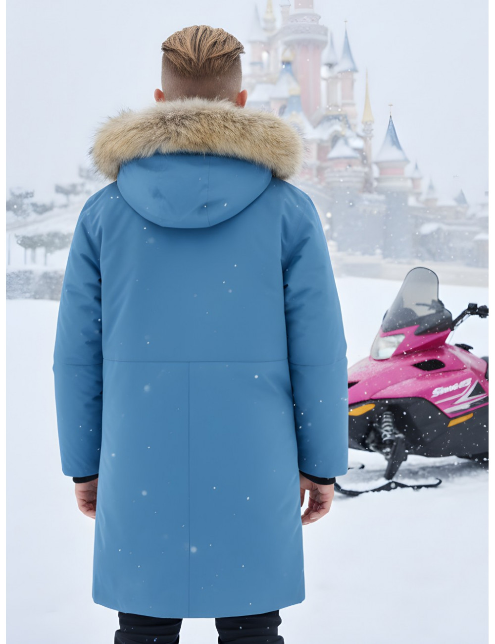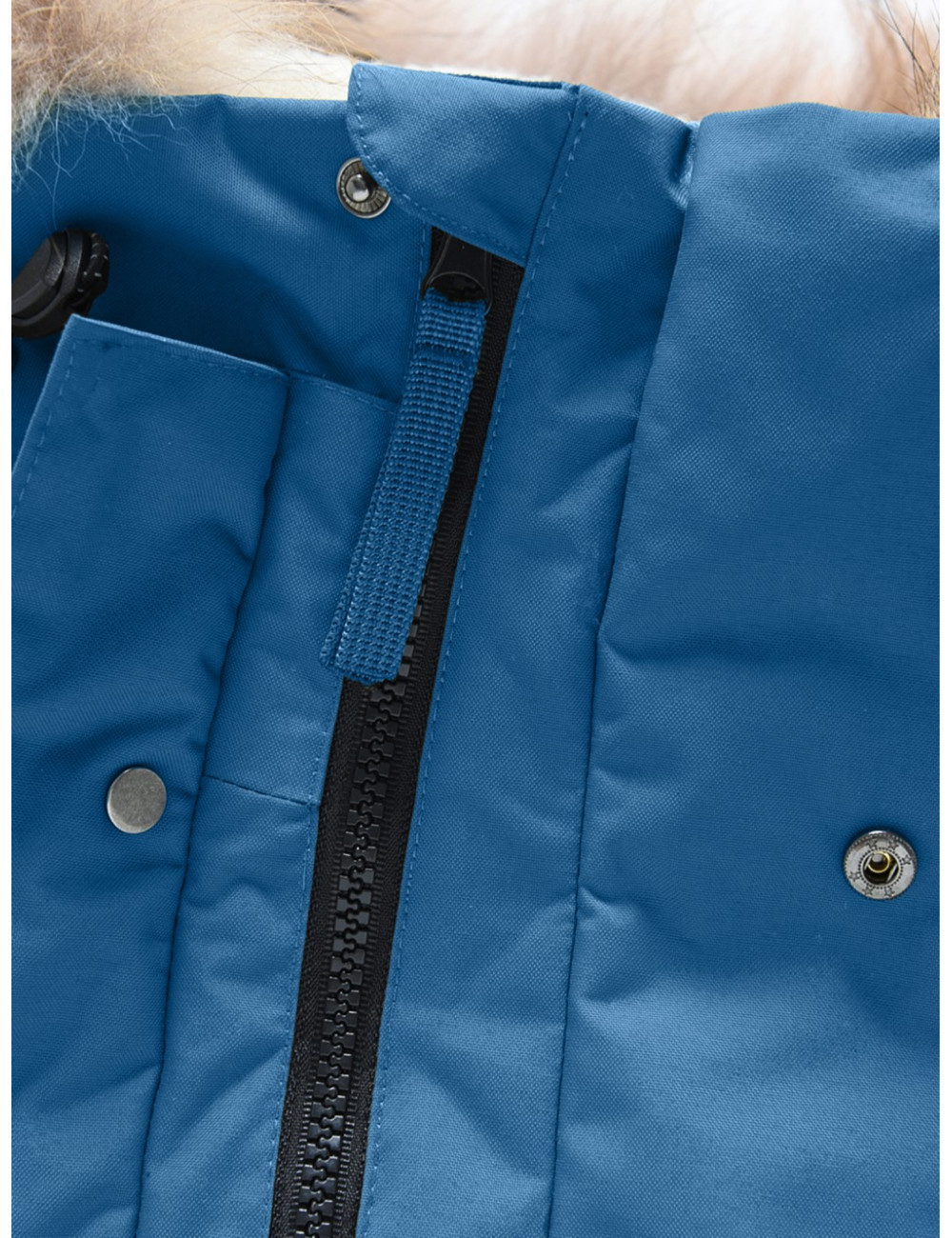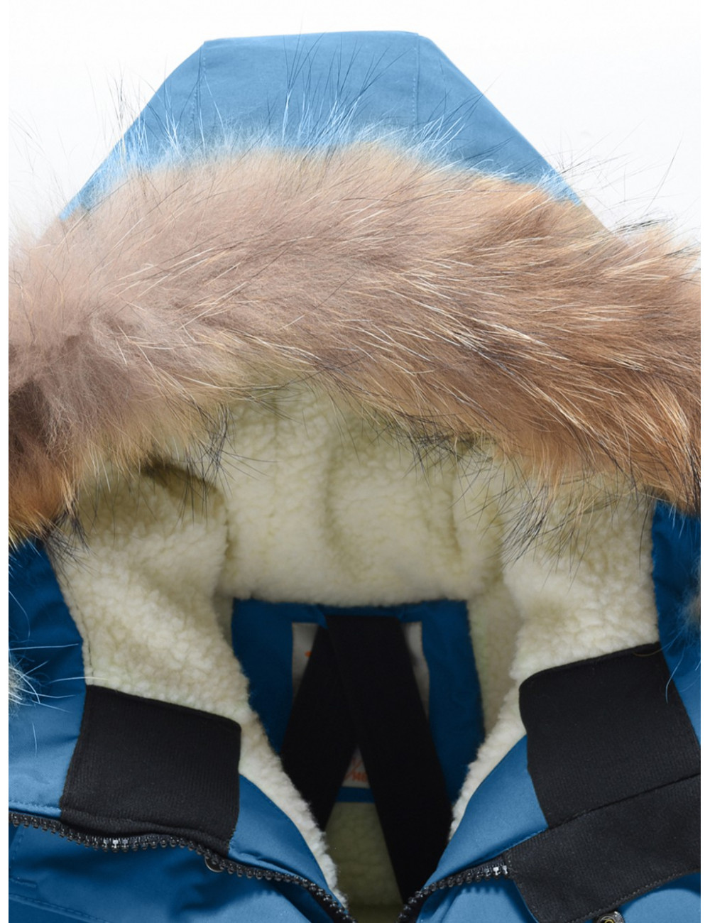- Капюшон: тёплый капюшон с натуральным мехом енота надёжно защищает от снега и ветра. Опушка на молнии при желании легко снимается.